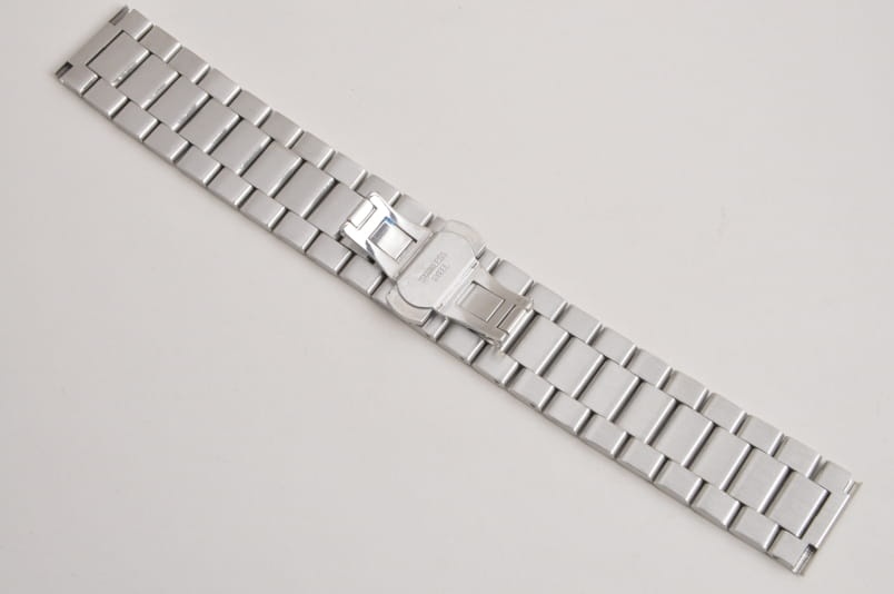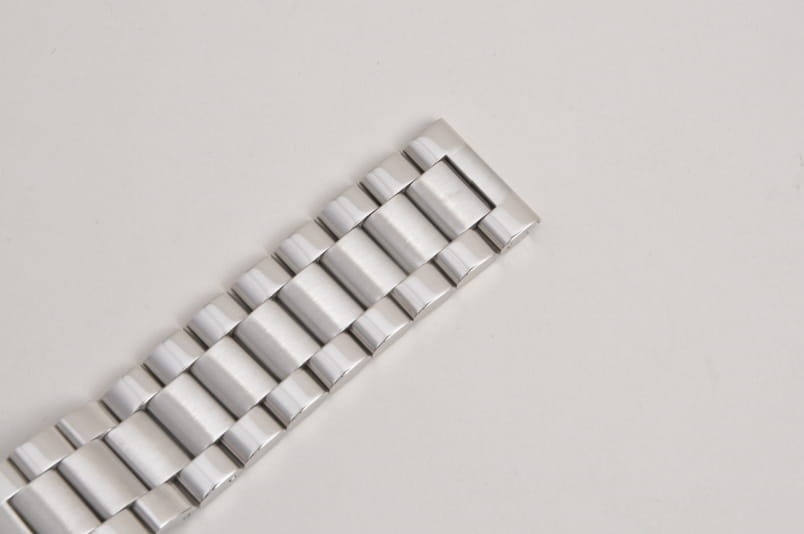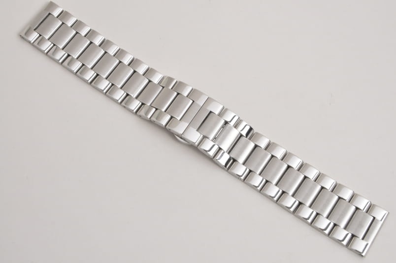 Stalowa, klasyczna, trzyrzędowa, elegancka bransoletka, wykończenie na wysoki połysk, środkowy rząd ogniw satynowy. Masywna, z pełnych ogniw (solid) o szerokości mocowania w zegarku 16mm.Równoległy fason. Zapięcie motylkowe na przyciski. Ogniwa skracane na sztyfty.