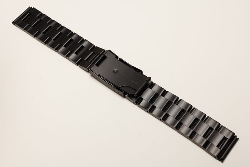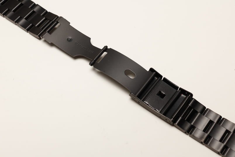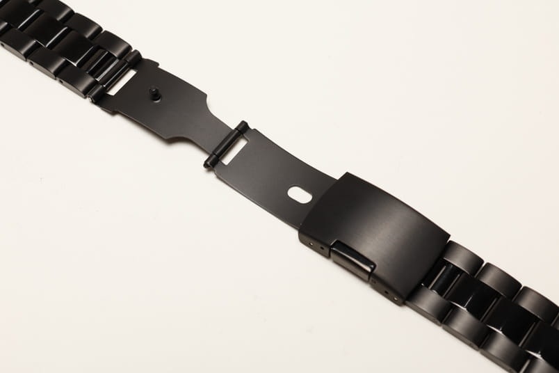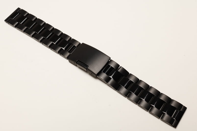 Stalowa, masywna bransoleta z prostym mocowaniem szerokości 20mm. Czarna powłoka PVD. Boczne ogniwa satynowe, środkowe błyszczące. Zapięcie na boczny przycisk. Ogniwa skracane na sztyfty. Równoległy fason.