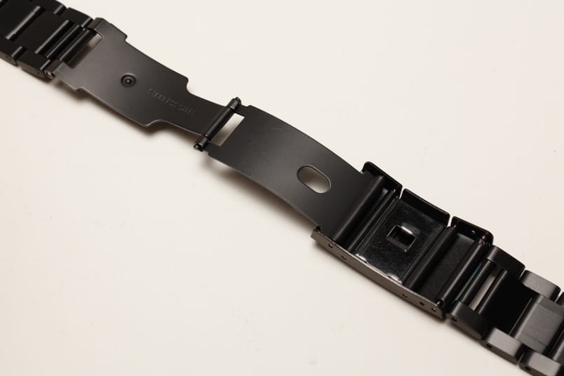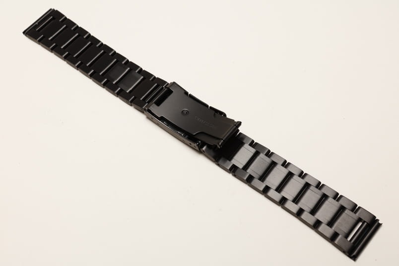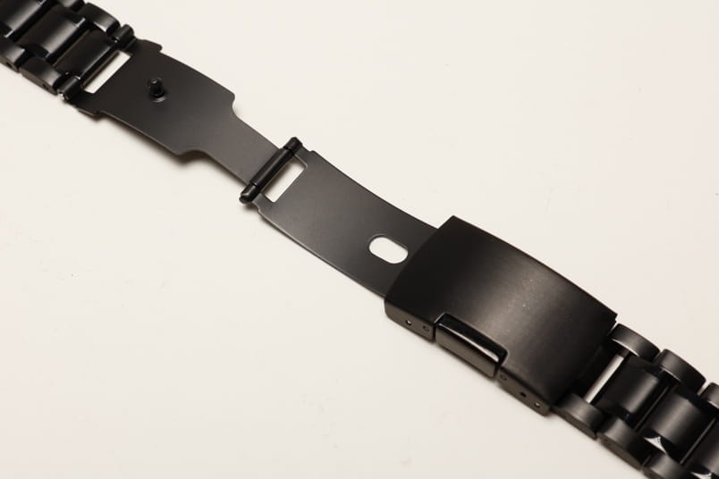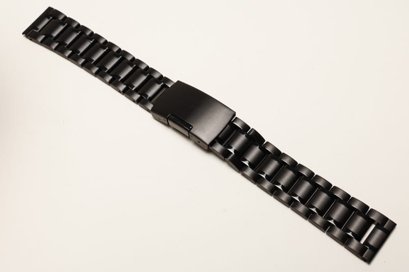 Stalowa bransoleta z prostym mocowaniem szerokości 20mm. Czarna powłoka PVD. Pięciorzędowa, boczne i środkowe ogniwa satynowe, pomiędzy błyszczące. Zapięcie na boczny przycisk. Ogniwa skracane na sztyfty.
