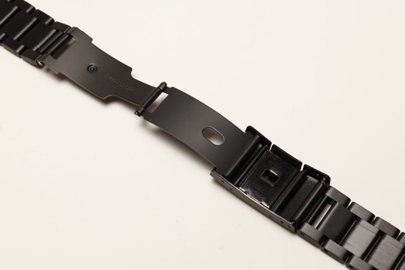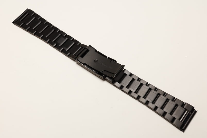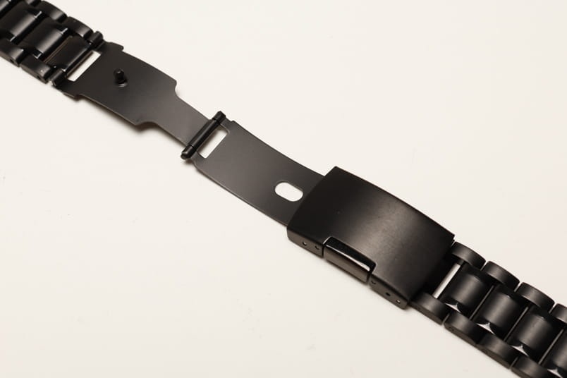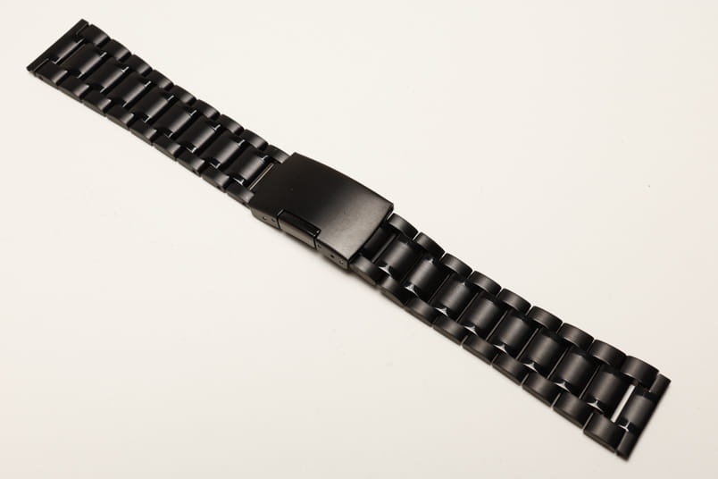 Stalowa bransoleta z prostym mocowaniem szerokości 22mm. Czarna powłoka PVD. Pięciorzędowa, boczne i środkowe ogniwa satynowe, pomiędzy błyszczące. Zapięcie na boczny przycisk. Ogniwa skracane na sztyfty.