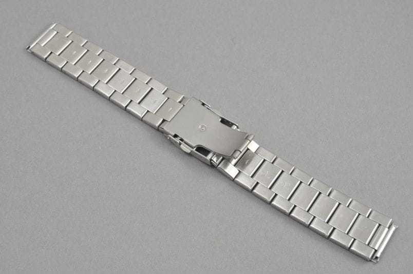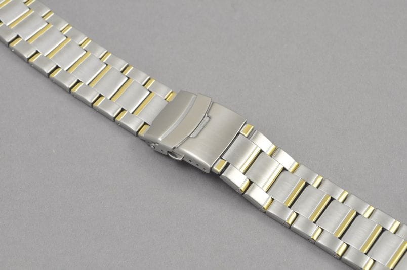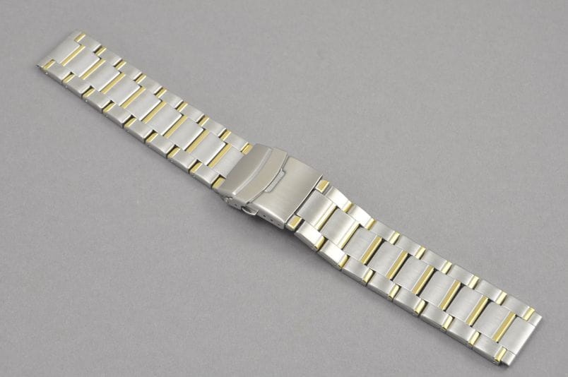 Stalowa, bikolorowa bransoleta z prostym mocowaniem szerokości 22mm.Satynowe ogniwa ,z delikatnymi,błyszczącymi wstawkami w kolorze złotym. Zapięcie na obustronny przycisk,z dodatkowym zabezpieczeniem. Ogniwa skracane na sztyfty.