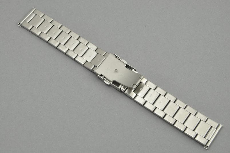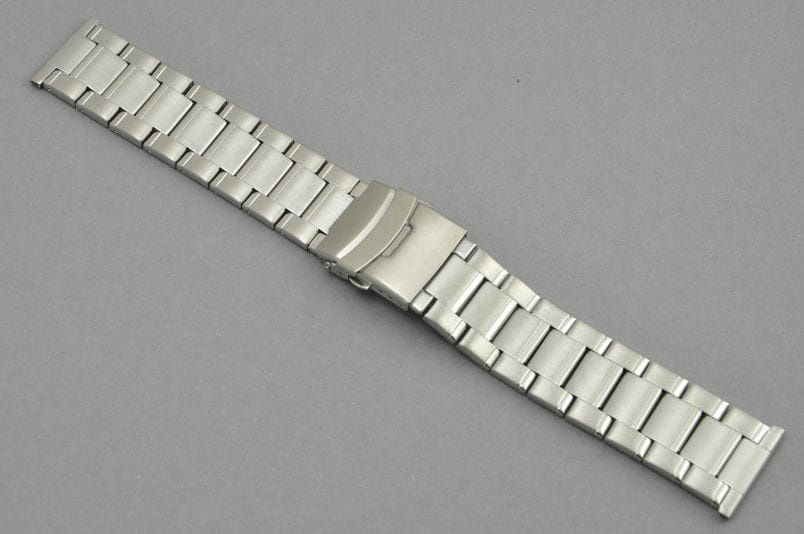 Stalowa bransoleta z prostym mocowaniem szerokości 20mm.Satynowe ogniwa ,z delikatnymi,błyszczącymi wstawkami. Zapięcie na obustronny przycisk,z dodatkowym zabezpieczeniem. Ogniwa skracane na sztyfty. Bransoleta na całej długości szersza o 2mm od mocowania do zegarka (20mm)