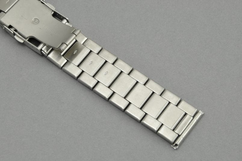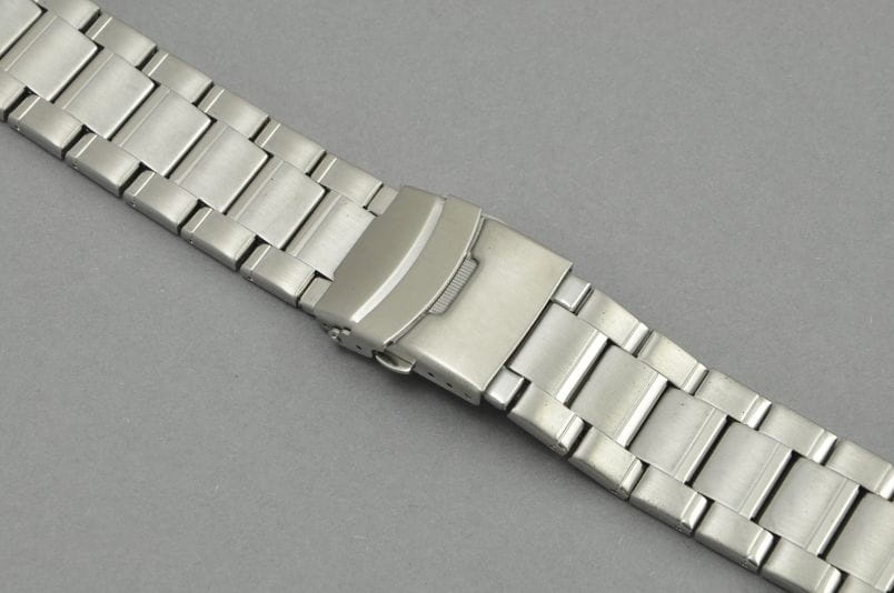 Stalowa bransoleta z prostym mocowaniem szerokości 22mm.Satynowe ogniwa ,z delikatnymi,błyszczącymi wstawkami. Zapięcie na obustronny przycisk,z dodatkowym zabezpieczeniem. Ogniwa skracane na sztyfty.