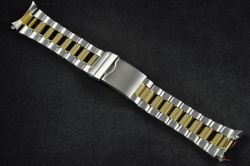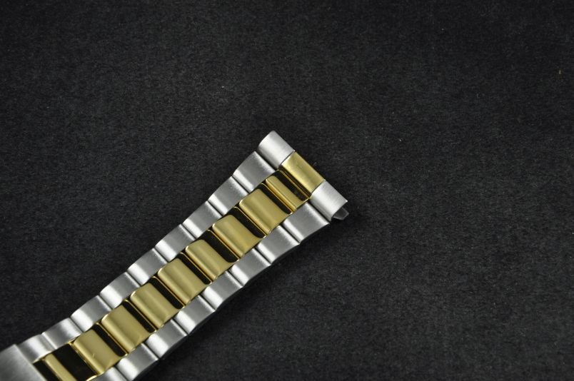 Stalowa bransoleta wykonana ze składanych ogniw w kolorze srebrnym i złotym. Klasyczny wzór, boczne ogniwa srebrne, satynowe. Środkowe ogniwa w kolorze złotym, błyszczące. Uniwersalne mocowanie w trzech rozmiarach 22/24/26mm z możliwością montażu przy pomocy profilowanej, zaokrąglonej maskownicy lub prostej końcówki. Regulowany zamek z zabezpieczeniem. Ogniwa skracane na zawleczki.
