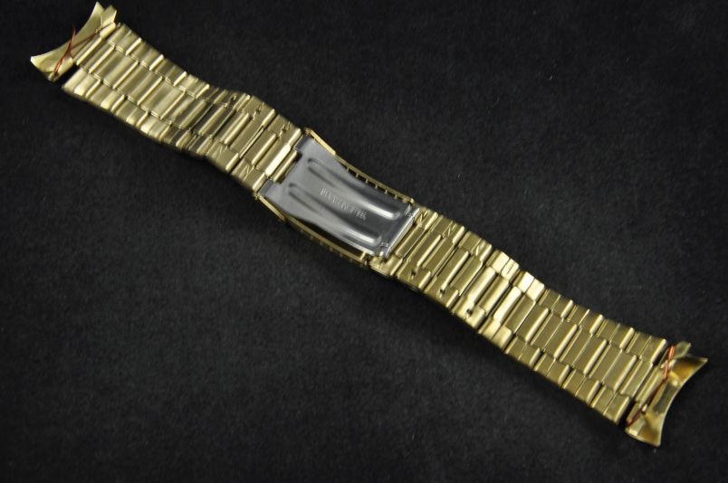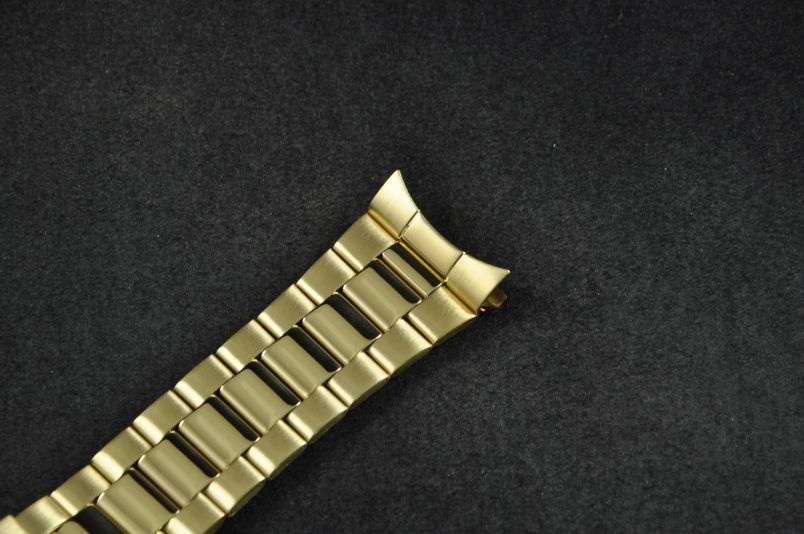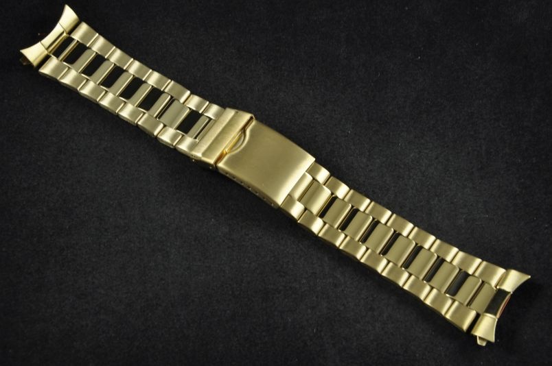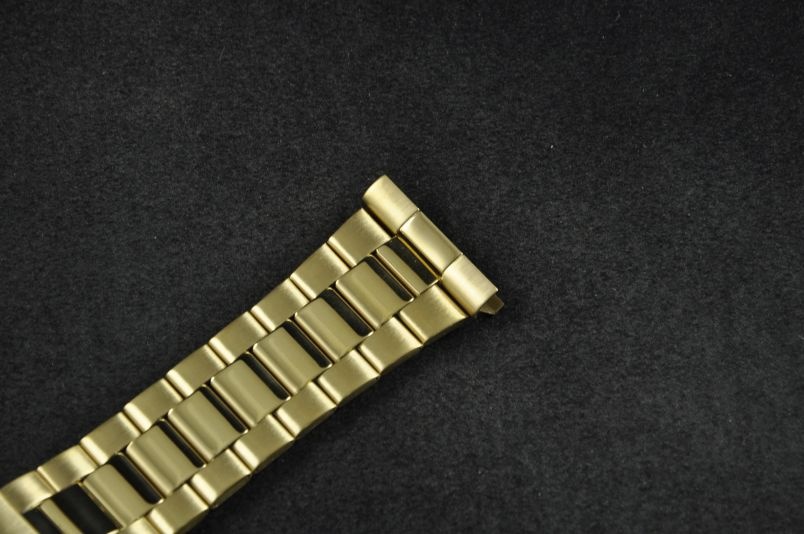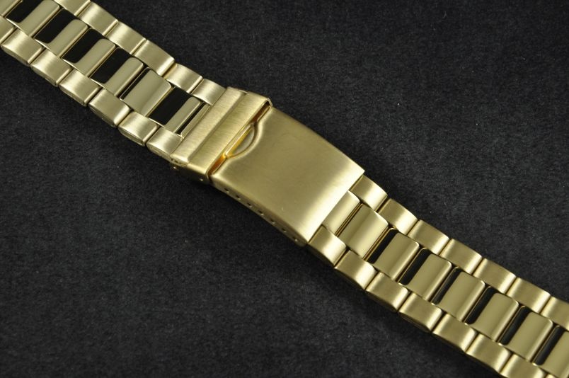 Stalowa bransoleta wykonana ze składanych ogniw w kolorze złotym. Klasyczny wzór, połączenie ogniw satynowych bocznych z wewnętrznymi ogniwkami w połysku. Uniwersalne mocowanie w trzech rozmiarach 22/24/26mm z możliwością montażu przy pomocy profilowanej, zaokrąglonej maskownicy lub prostej końcówki. Regulowany zamek z zabezpieczeniem. Ogniwa skracane na zawleczki.