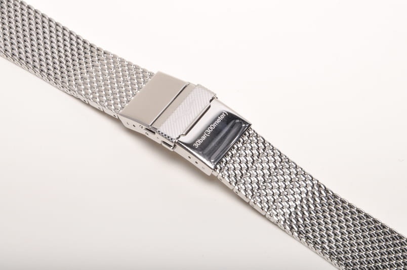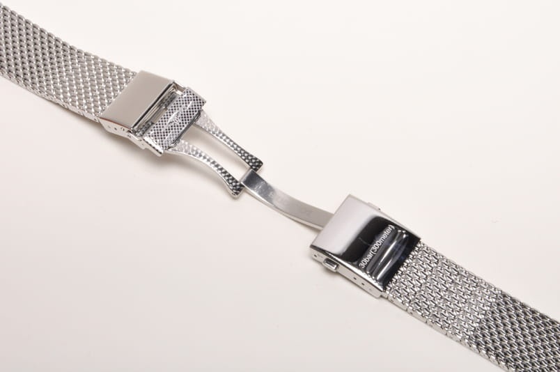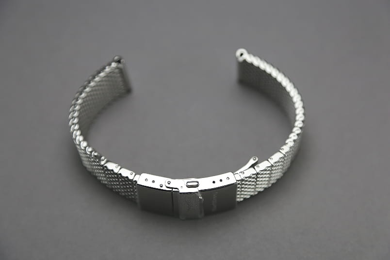 Oryginalna, stalowa bransoletka typu mesh. Grube, masywne ogniwa. Zapięcie motylkowe na przycisk, z pięciostopniową mikro regulacją i zabezpieczeniem. Możliwa regulacja przez skracanie ogniw. W komplecie oryginalne teleskopy.
