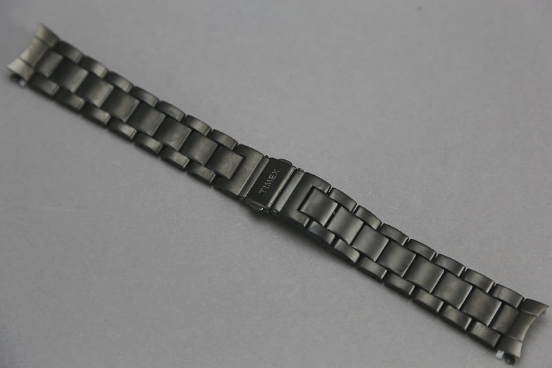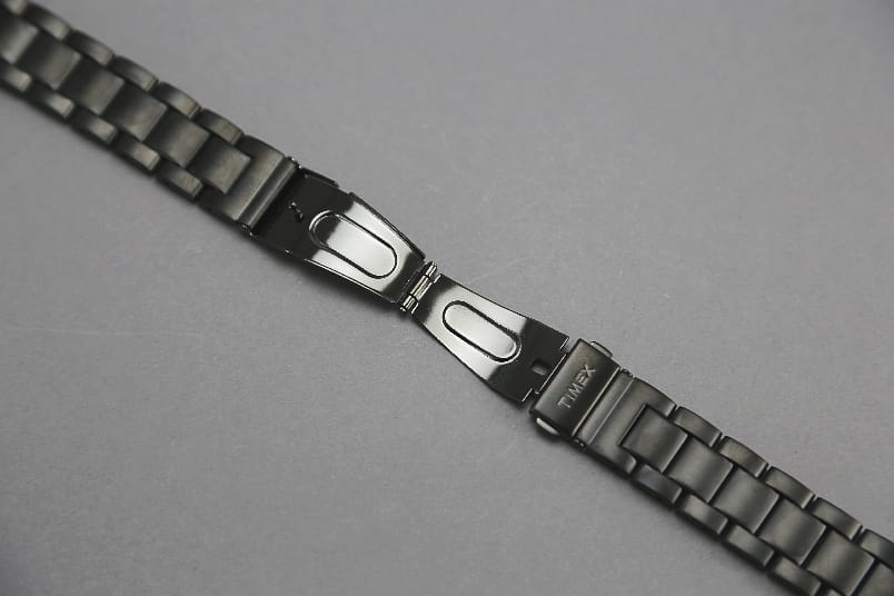 Stalowa bransoleta w matowym wykończeniu. Zamek na przycisk, widoczne logo Timex. W zestawie wypełniacze profilowane. Ogniwa skracane na sztyfty.