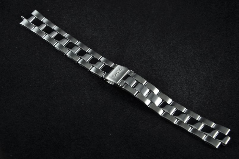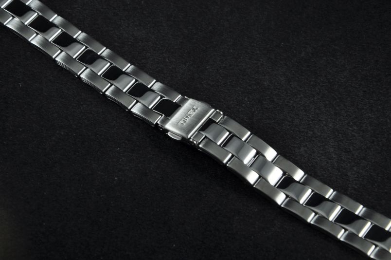 Stalowa bransoleta w kolorze srebrnym. Boczne ogniwa satynowe, wewnętrzne z połyskiem. Zamek na przycisk, widoczne logo Timex. W zestawie wypełniacze.