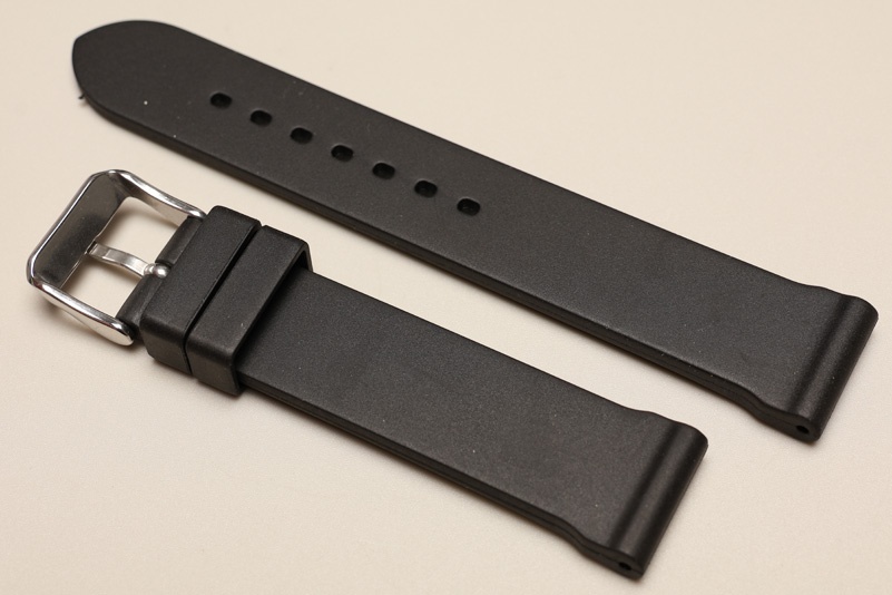 Elastyczny, miękki i wodoodporny pasek.Wykonany z kauczuku, grubość 5mm. Pasuje do większości zegarków z teleskopem 22mm. Stalowa, błyszcząca klamerka, z językiem szerokości 4mm, podwójna szlufka. Piękny, matowy, gładki pasek z ozdobną fazą na brzegach.