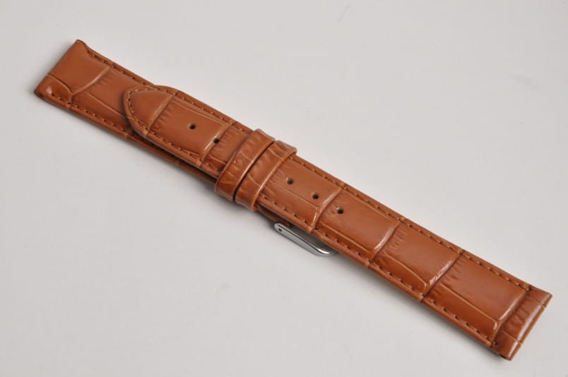 Wykonany z naturalnej, skóry, imitacja skóry aligatora. Lekko błyszczący, przeszyty nicią w kolorze paska. Płaski, miękki pasek. Skórzana, gładka futrówka. Podwójna szlufka. Stalowa klamerka.