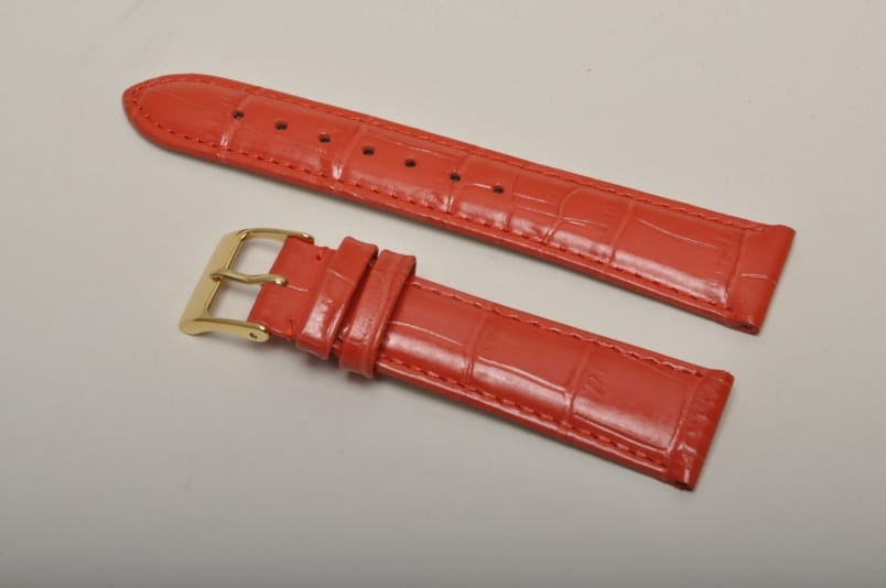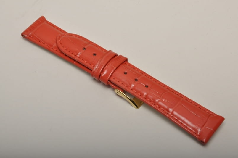 Wykonany z naturalnej skóry, imitacja skóry aligatora. Lekki połysk, przeszyty nicią w kolorze paska. Płaski, miękki pasek. Skórzana futrówka. Podwójna szlufka. Stalowa klamerka.