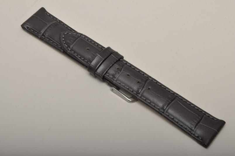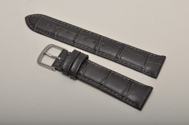 Wykonany z naturalnej skóry, imitacja skóry aligatora. Lekki połysk, przeszyty nicią w kolorze paska. Płaski, miękki pasek. Skórzana futrówka. Podwójna szlufka. Stalowa klamerka.
