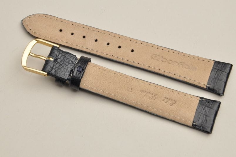 Wykonany z naturalnej, skóry, imitacja skóry warana. Błyszczący, przeszyty nicią w kolorze paska. Płaski, miękki pasek. Skórzana, gładka futrówka. Podwójna szlufka. Stalowa klamerka.