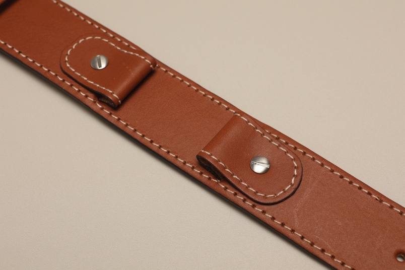 Pasek wykonany ze skóry w kolorze brązowym. Grubość paska 2,8mm. Jednoczęściowa, szeroka podkładka. Przeszyty białą nicią. Mocowania regulowane na śrubki. Dwie szlufki, w tym jedna z pętelką ograniczającą. Stalowa klamerka.