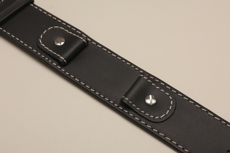 Pasek wykonany ze skóry w kolorze ciemny brąz. Grubość paska 2,8mm. Jednoczęściowa, szeroka podkładka. Przeszyty białą nicią. Mocowania regulowane na śrubki. Dwie szlufki, w tym jedna z pętelką ograniczającą. Stalowa klamerka.