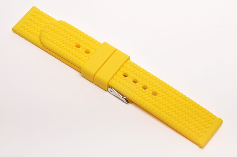 Pasek typu oponka, z charakterystycznym wzorem, wykonany z miękkiego silikonu. Równoległy fason. Dwie ruchome szlufki, stalowa klamerka. Pasek z szybkimi teleskopami