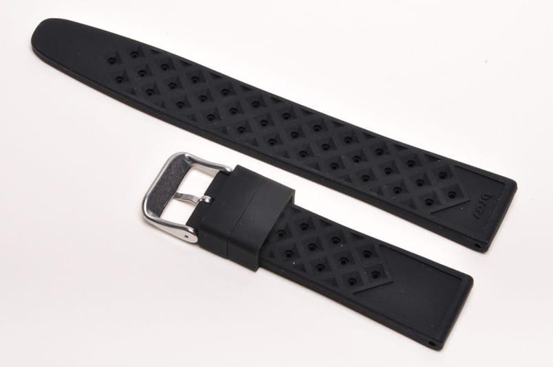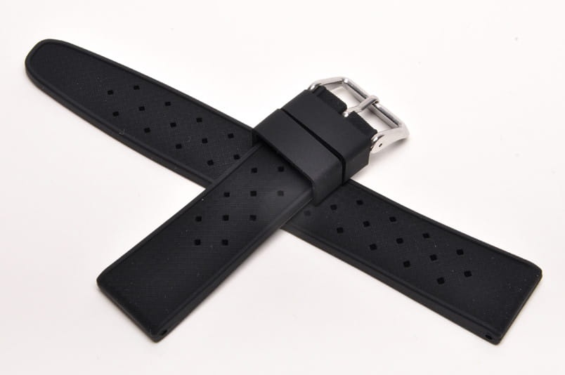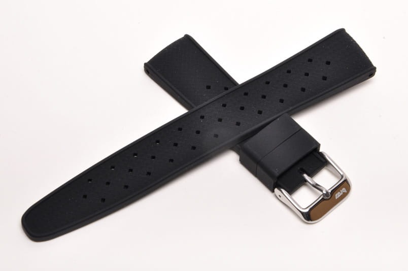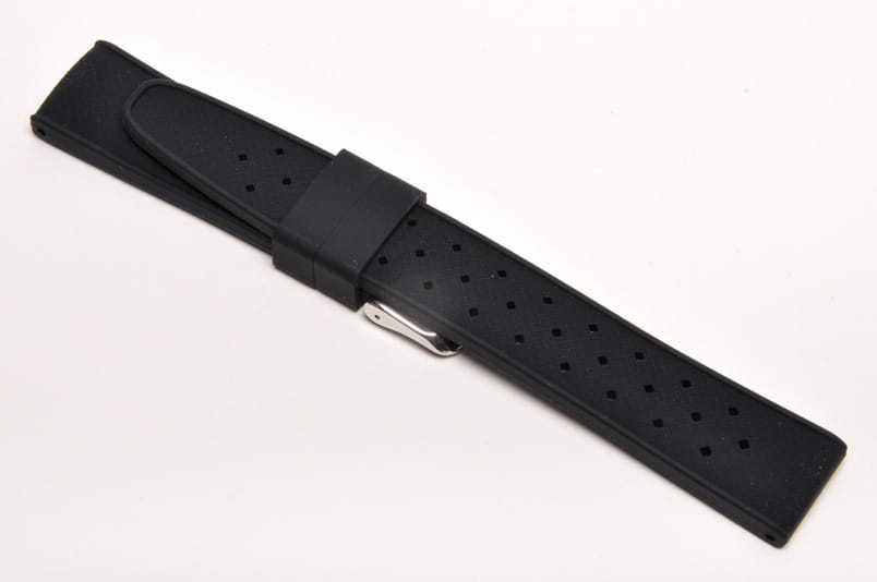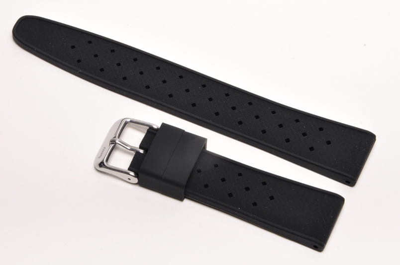 Pasek typu tropic, z charakterystycznymi otworami, wykonany z silikonu wysokiej jakości w pięknym kolorze. Od strony wierzchniej brzeg paska lekko podniesiony, na spodzie profil zapewniający wentylację. Dwie ruchome szlufki, stalowa klamerka. Bardzo estetyczny, miękki pasek, pasuje do wszystkich zegarków z mocowaniem 20mm, na przykład Rolex, Omega, MoonSwatch