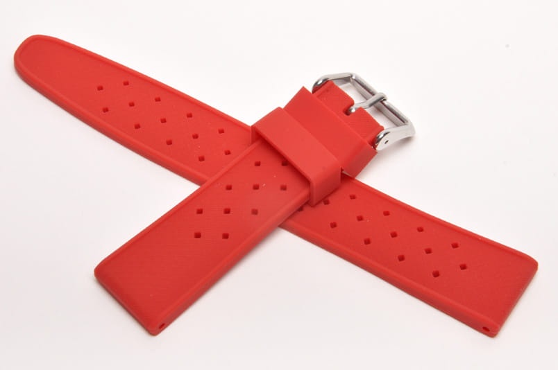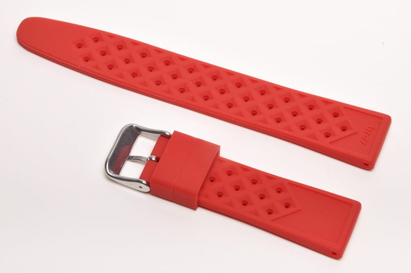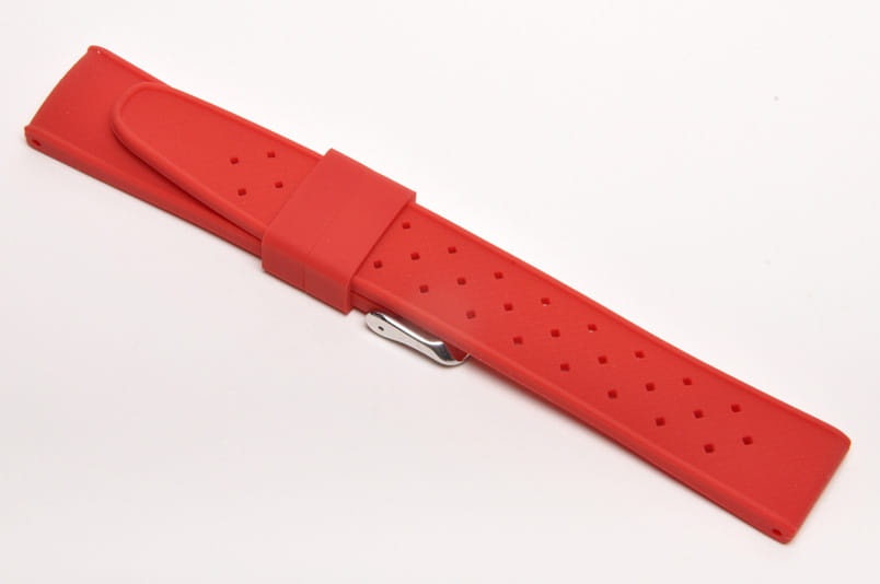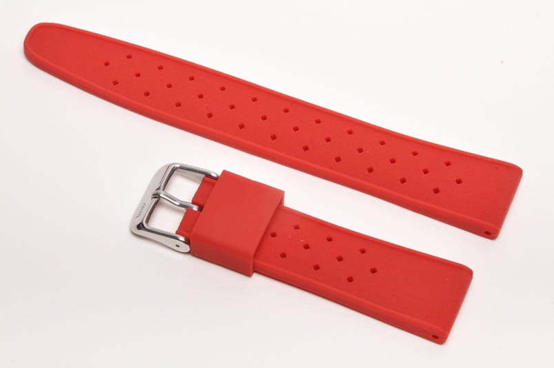 Pasek typu tropic, z charakterystycznymi otworami, wykonany z silikonu wysokiej jakości w pięknym kolorze. Od strony wierzchniej brzeg paska lekko podniesiony, na spodzie profil zapewniający wentylację. Dwie ruchome szlufki, stalowa klamerka. Bardzo estetyczny, miękki pasek, pasuje do zegarków z mocowaniem 22mm