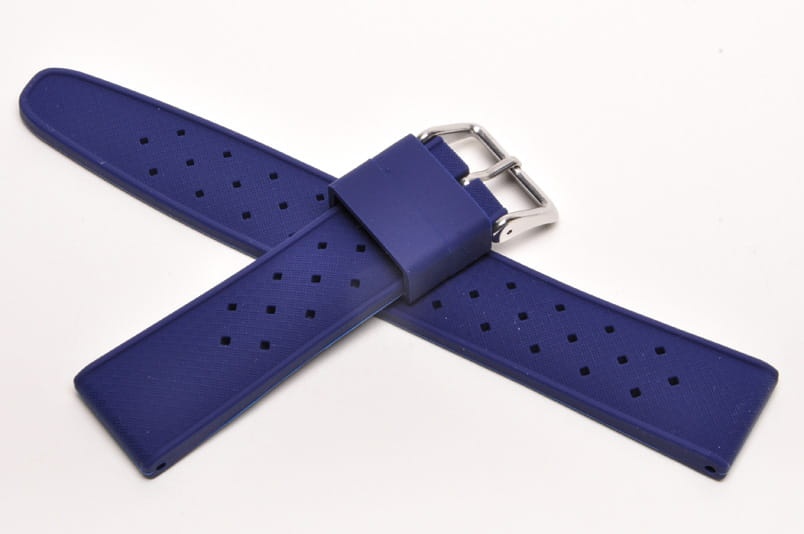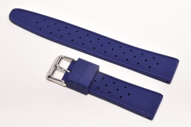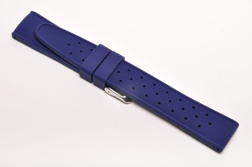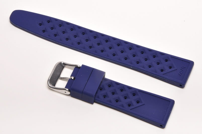 Pasek typu tropic, z charakterystycznymi otworami, wykonany z silikonu wysokiej jakości w pięknym kolorze. Od strony wierzchniej brzeg paska lekko podniesiony, na spodzie profil zapewniający wentylację. Dwie ruchome szlufki, stalowa klamerka. Bardzo estetyczny, miękki pasek, pasuje do wszystkich zegarków z mocowaniem 20mm, na przykład Rolex, Omega, MoonSwatch
