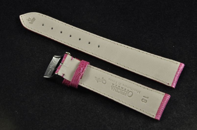 Pasek włoskiej firmy Bros. Ręcznie szyty z naturalnej skóry warana. Delikatnie pogrubiany. Brzegi paska cięte. Błyszczące wykończenie skóry. Obszycie pod kolor paska. Do eleganckich i klasycznych zegarków.