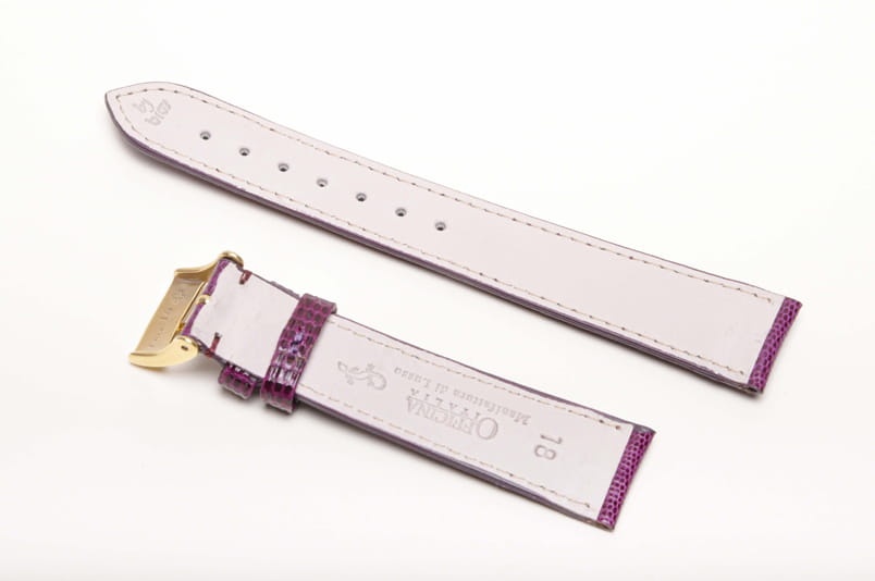 Obszycie pod kolor paska, stalowa klamerka. Do eleganckich i klasycznych zegarków.