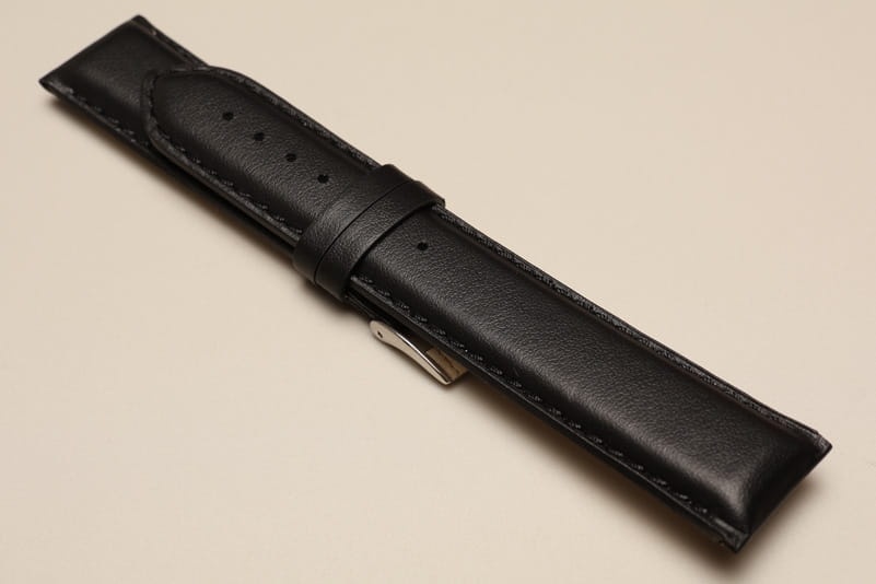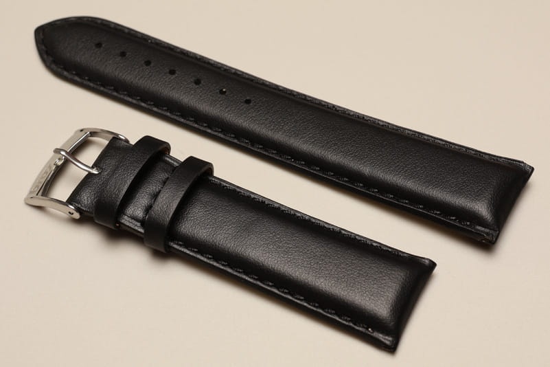 Oryginalny pasek włoskiej firmy Bros. Wykonany z naturalnej skóry. Matowy, gładki. Przeszywany nicią w kolorze paska. Pogrubiany przy zegarku do 5mm, przy zapięciu 4mm grubości. Podwójna szlufka, stalowa klamerka.