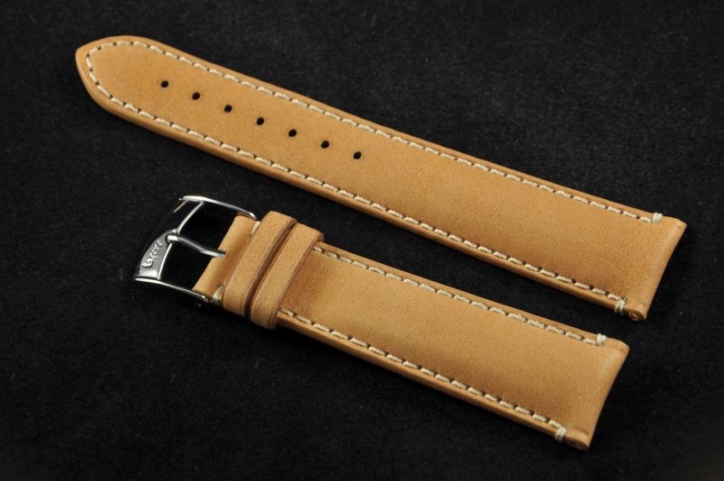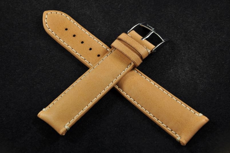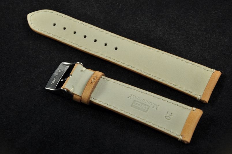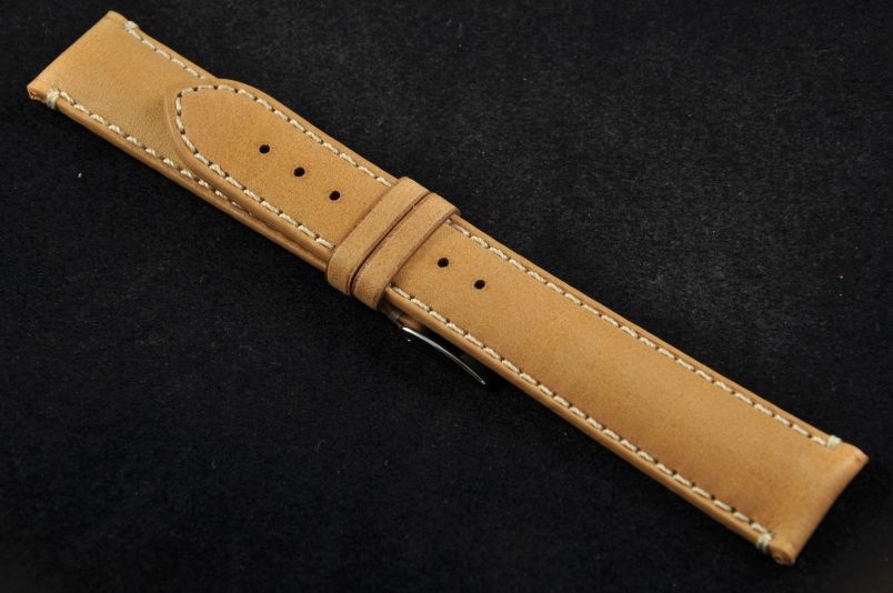 Do zegarków z mocowaniem 20mm. Uszyty z naturalnej skóry, gładki. Pogrubiony do 4,5mm. Miękki i elastyczny. Przeszyty jasną nicią. Podwójna szlufka, stalowa klamerka.