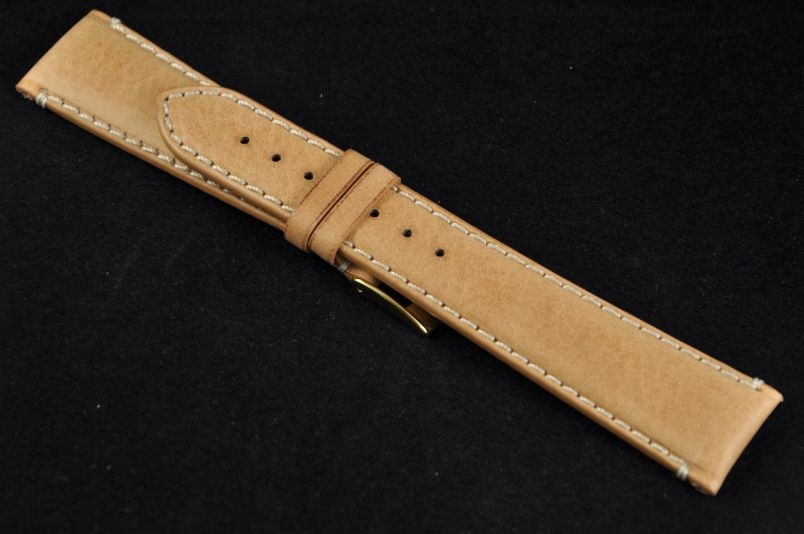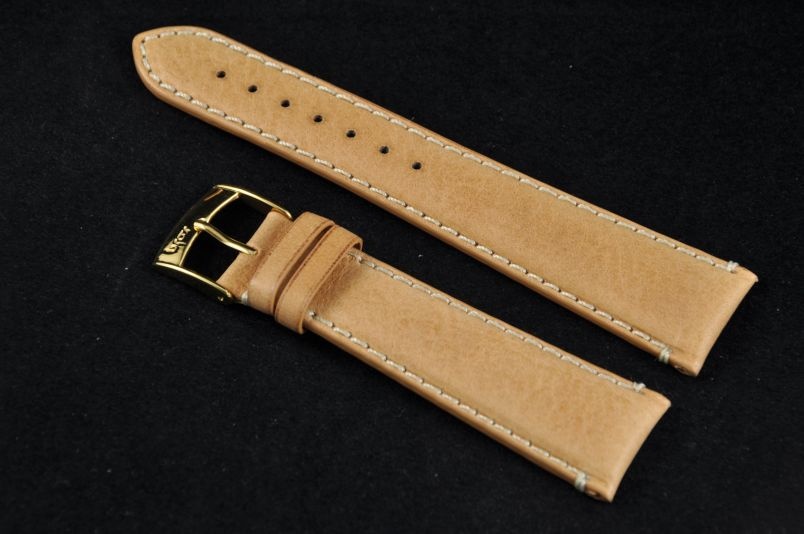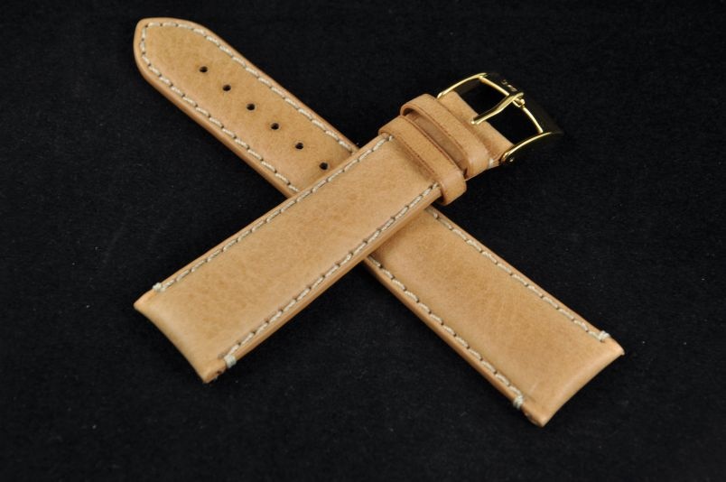 Do zegarków z mocowaniem 24mm. Uszyty z naturalnej skóry, gładki. Pogrubiony do 4,5mm. Miękki i elastyczny. Przeszyty jasną nicią. Podwójna szlufka, stalowa klamerka.