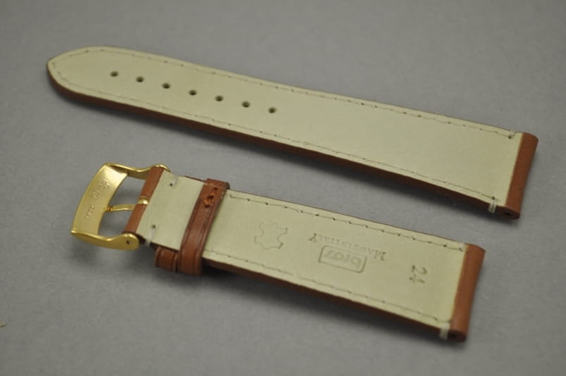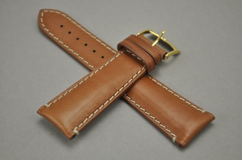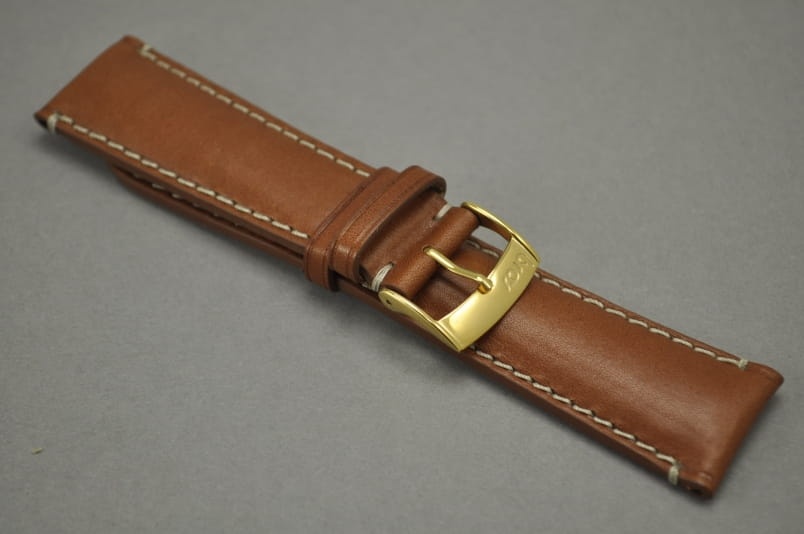 Do zegarków z mocowaniem 24mm. Uszyty z naturalnej skóry, gładki. Pogrubiony do 4,5mm. Miękki i elastyczny. Przeszyty jasną nicią. Podwójna szlufka, stalowa klamerka.