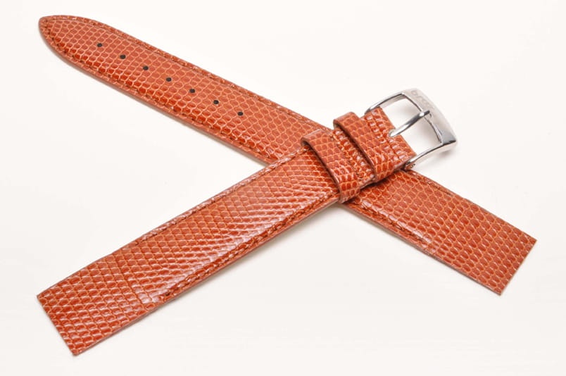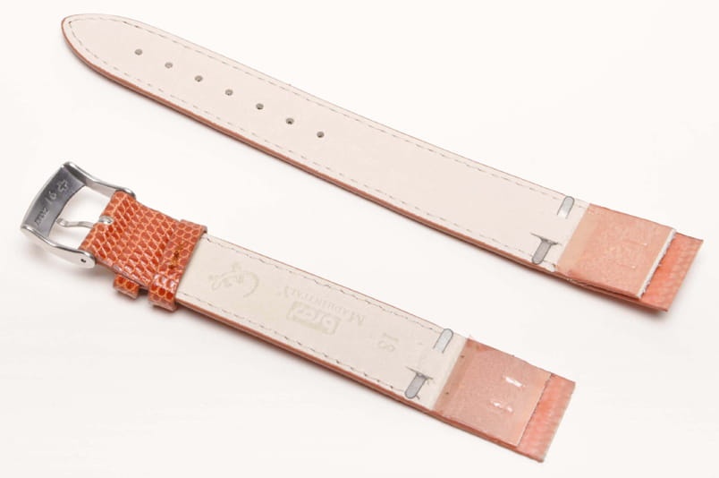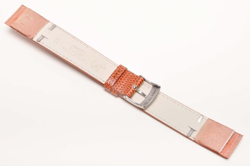Specjalne mocowanie do zegarków ze stałym uchem (brak teleskopów). Wzmacniane blaszką, podwójnie zaklejane końce. Wykonany z prawdziwej skóry z jaszczurki. Lakierowany. Przeszycie w kolorze paska. Podwójna szlufka, stalowa klamerka. Do wiekowych oraz markowych złotych zegarków.