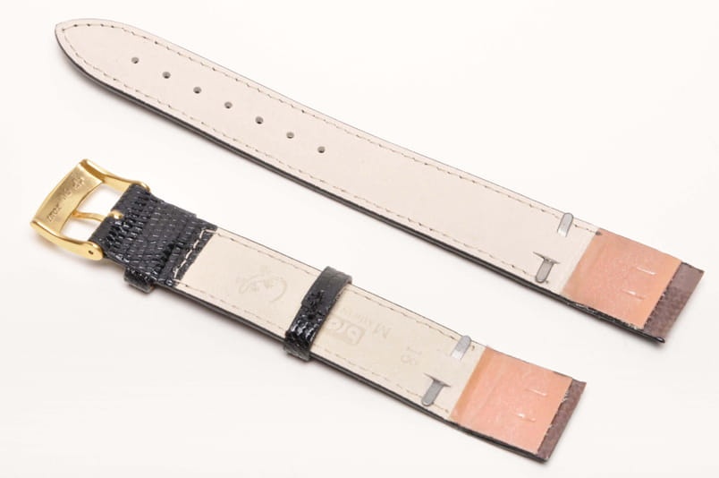 Specjalne mocowanie do zegarków ze stałym uchem (brak teleskopów). Wzmacniane blaszką, podwójnie zaklejane końce. Wykonany z prawdziwej skóry z jaszczurki. Lakierowany. Przeszycie w kolorze paska. Podwójna szlufka, stalowa klamerka. Do wiekowych oraz markowych złotych zegarków.