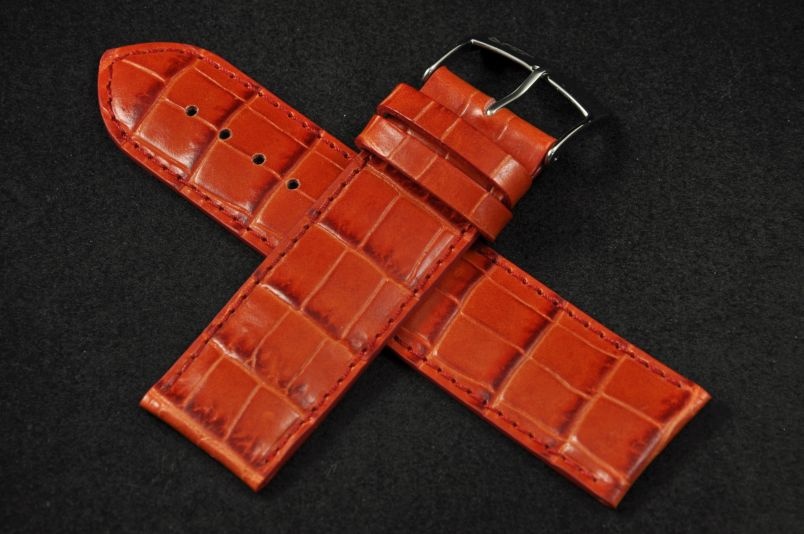 Wykonany ze skóry naturalnej tłoczonej na wzór skóry aligatora. Lakierowany z połyskiem. Delikatnie pogrubiany do 3mm. Obszyty nicią w kolorze paska. Podwójna szlufka. Stalowa klamerka. Równoległy fason.