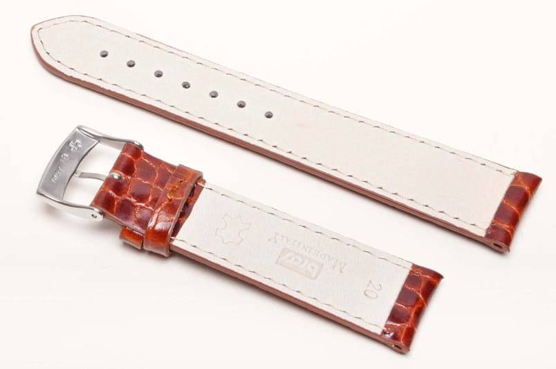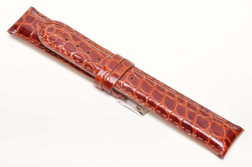 Oryginalny pasek Bros. Wykonany ze skóry naturalnej tłoczonej na wzór skóry krokodyla. Błyszczący, lakierowany, pogrubiany. Obszyty nicią w kolorze paska. Podwójna szlufka. Stalowa klamerka. Grubość paska 5 mm. Do klasycznych zegarków.