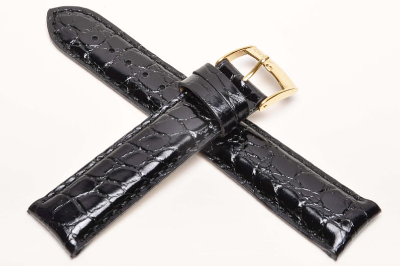 Oryginalny pasek Bros. Wykonany ze skóry naturalnej tłoczonej na wzór skóry krokodyla. Błyszczący, lakierowany, pogrubiany do 5mm. Obszyty nicią w kolorze paska. Podwójna szlufka. Stalowa klamerka. Do klasycznych zegarków.