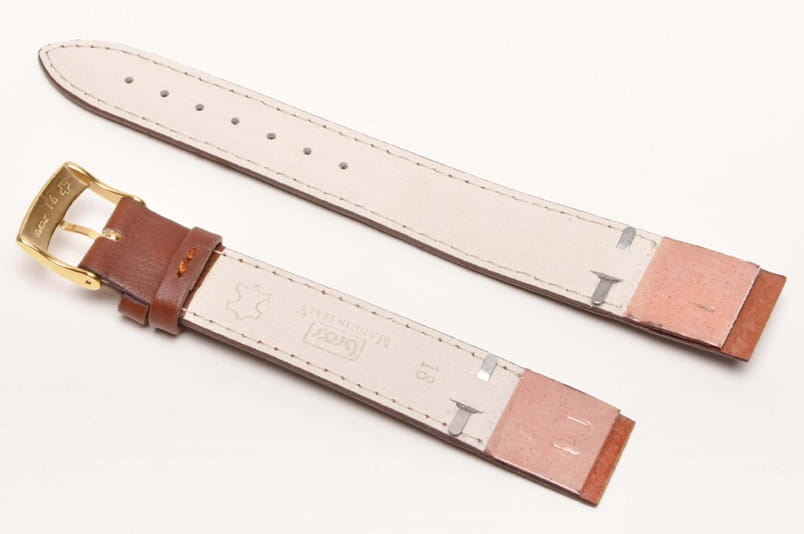 Specjalne mocowanie do zegarków ze stałym uchem (brak teleskopów). Wzmacniane blaszką, podwójnie zaklejane końce. Wykonany z gładkiej, matowej skóry. Przeszycie w kolorze paska. Podwójna szlufka, stalowa klamerka. Do wiekowych oraz markowych złotych zegarków.