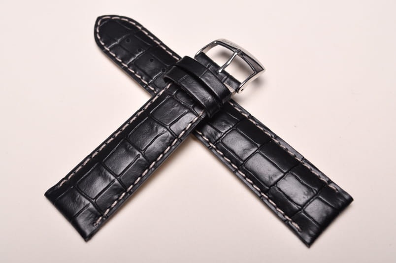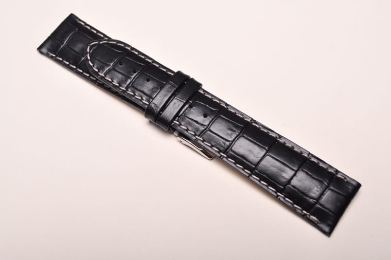 Wykonany ze skóry naturalnej tłoczonej na wzór skóry aligatora. Matowy i miękki. Obszyty białą nicią. Podwójna szlufka. Stalowa klamerka. Grubość paska 3mm. Bardzo dobrze komponuje się z większymi zegarkami zarówno klasycznymi jak i sportowymi.