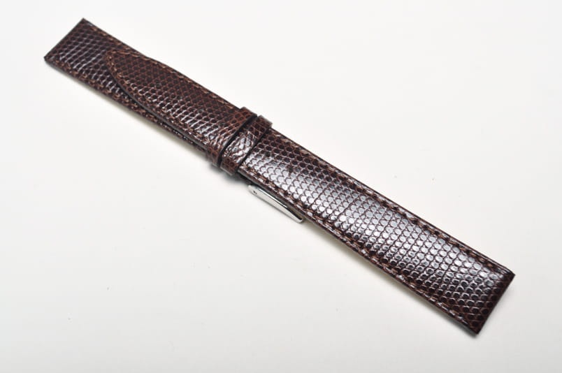 Wykonany z naturalnej skóry jaszczurki. Błyszczący, lakierowany. Miękki i elastyczny. Obszyty nicią w kolorze paska. Podwójna szlufka. Stalowa klamerka. Grubość paska 2,2 mm. Zwężający się pasek do klasycznych zegarków.