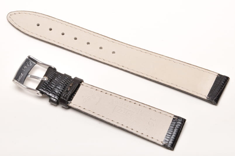 Wykonany z naturalnej skóry jaszczurki. Błyszczący, lakierowany. Miękki i elastyczny. Obszyty nicią w kolorze paska. Podwójna szlufka. Stalowa klamerka. Grubość paska 2,2 mm. Elegancki pasek do klasycznych zegarków.
