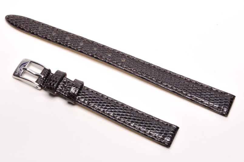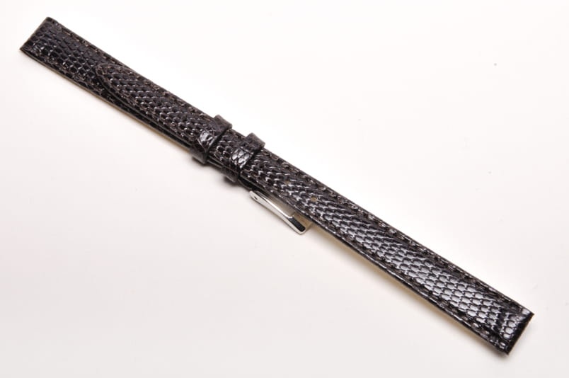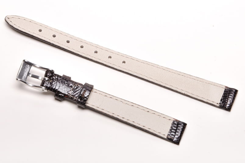 Wykonany z naturalnej skóry jaszczurki. Błyszczący, lakierowany. Miękki i elastyczny. Obszyty nicią w kolorze paska. Podwójna szlufka. Stalowa klamerka. Grubość paska 2,2 mm. Elegancki pasek do klasycznych zegarków.