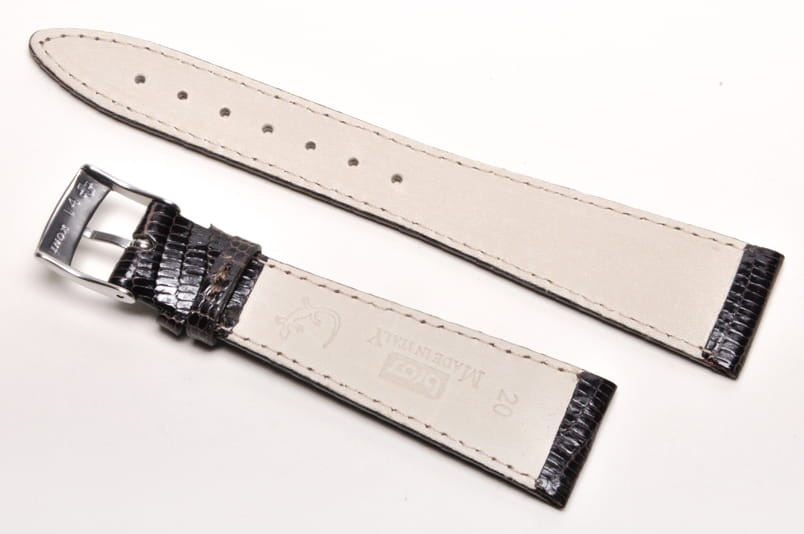 Wykonany z naturalnej skóry jaszczurki. Błyszczący, lakierowany. Miękki i elastyczny. Obszyty nicią w kolorze paska. Podwójna szlufka. Stalowa klamerka. Grubość paska 2,2 mm. Zwężający się pasek do klasycznych zegarków.