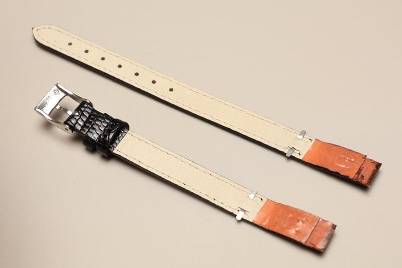 Specjalne mocowanie do zegarków ze stałym uchem (brak teleskopów). Wzmacniane blaszką, podwójnie zaklejane końce. Wykonany z prawdziwej skóry z jaszczurki. Lakierowany. Przeszycie w kolorze paska. Podwójna szlufka, stalowa klamerka. Do wiekowych oraz markowych złotych zegarków.