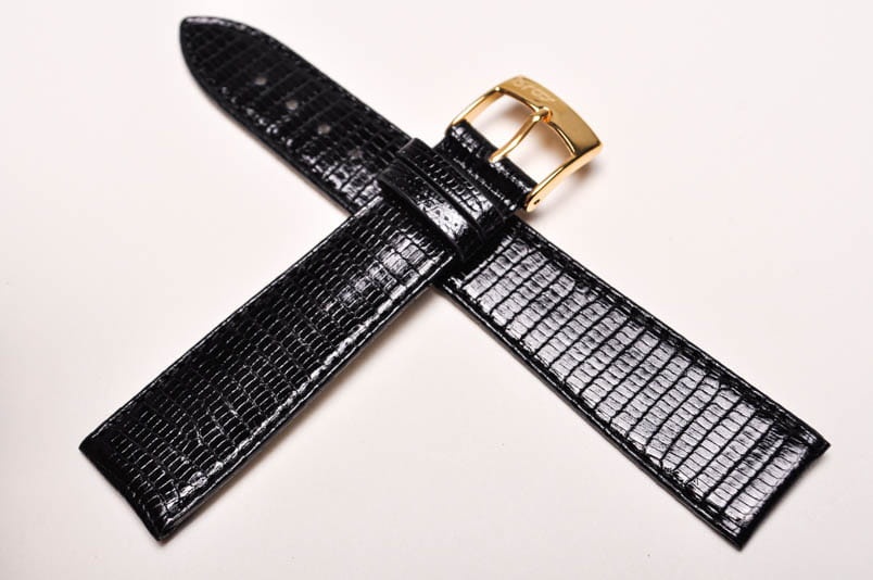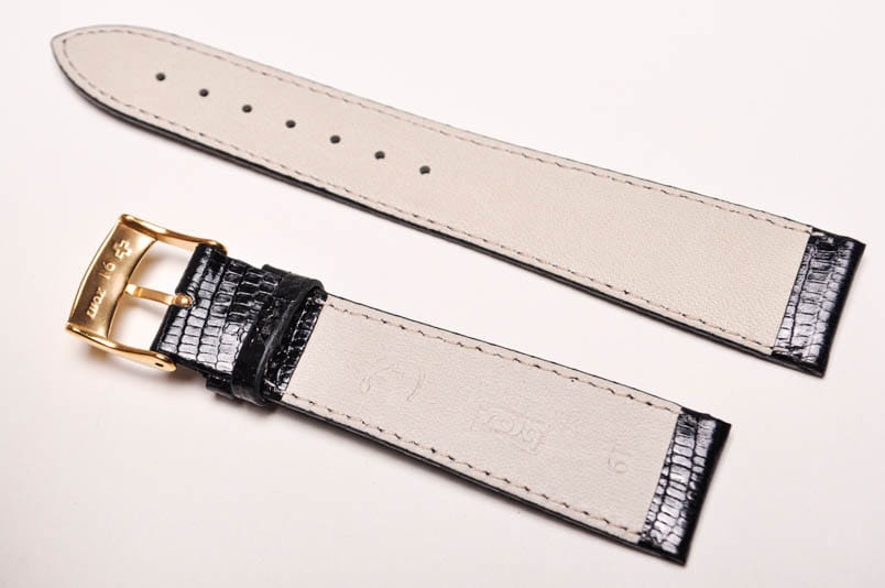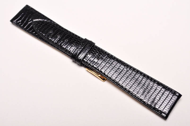 Wykonany z naturalnej skóry jaszczurki. Błyszczący, lakierowany w kolorze czarnym. Obszyty czarną nicią. Klamerka 16 mm. Podwójna szlufka. Stalowa klamerka. Grubość paska 2,2 mm. Pasek do markowych zegarków, z możliwością przełożenia oryginalnej klamerki.