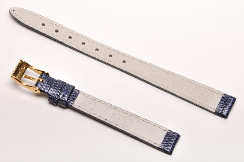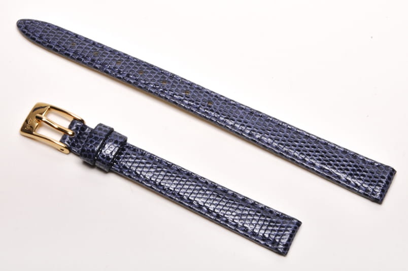 Wykonany z naturalnej skóry jaszczurki. Błyszczący, lakierowany w kolorze granatowym. Obszyty nicią w kolorze paska. Klamerka 8 mm. Podwójna szlufka. Stalowa klamerka. Grubość paska 2,2 mm. Zwężający się pasek do damskich, klasycznych zegarków.