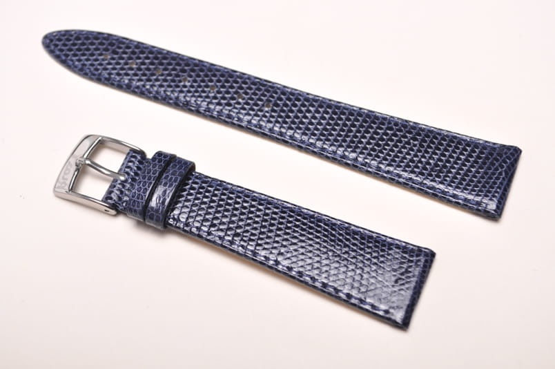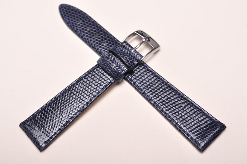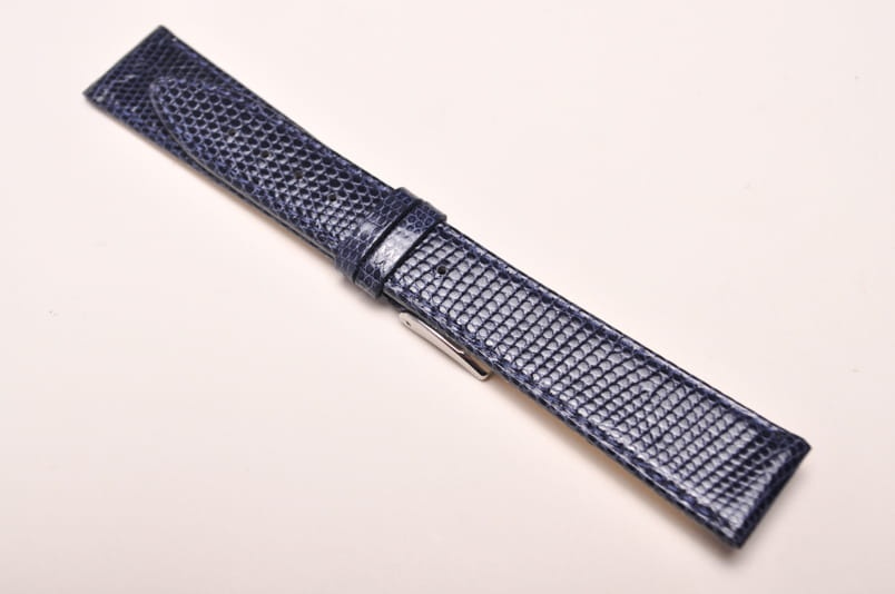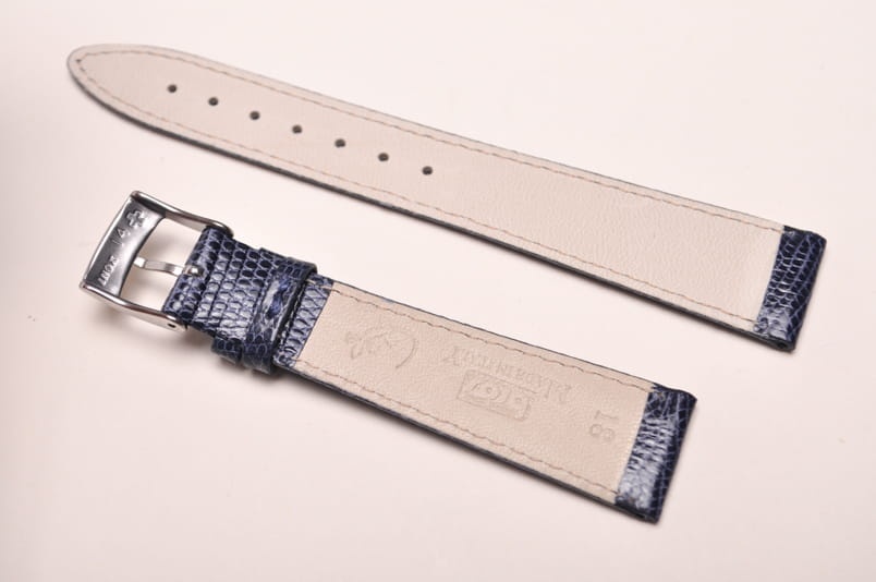 Wykonany z naturalnej skóry jaszczurki. Błyszczący, lakierowany w kolorze granatowym. Obszyty nicią w kolorze paska. Klamerka 14 mm. Podwójna szlufka. Stalowa klamerka. Grubość paska 2,2 mm. Zwężający się pasek do klasycznych zegarków np Omega, Longines, Zenith
