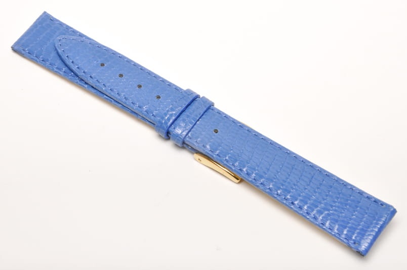 Wykonany z naturalnej skóry jaszczurki. Błyszczący, lakierowany w kolorze niebieskim. Obszyty nicią w kolorze paska. Podwójna szlufka. Stalowa klamerka. Grubość paska 2,2 mm.Elegancki, miękki pasek do klasycznych zegarków.