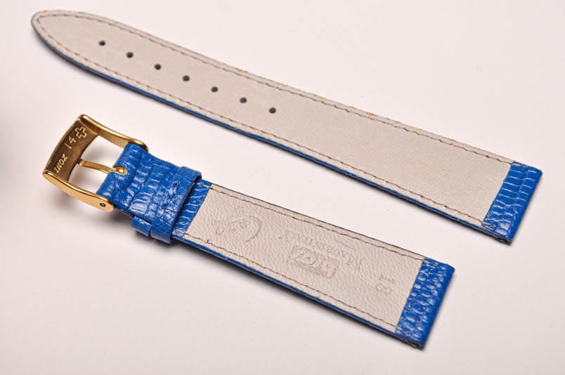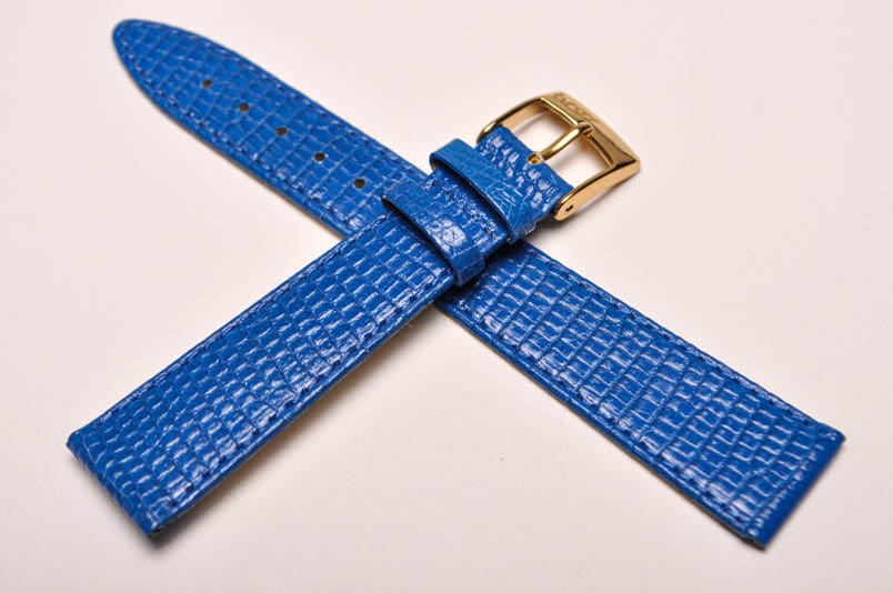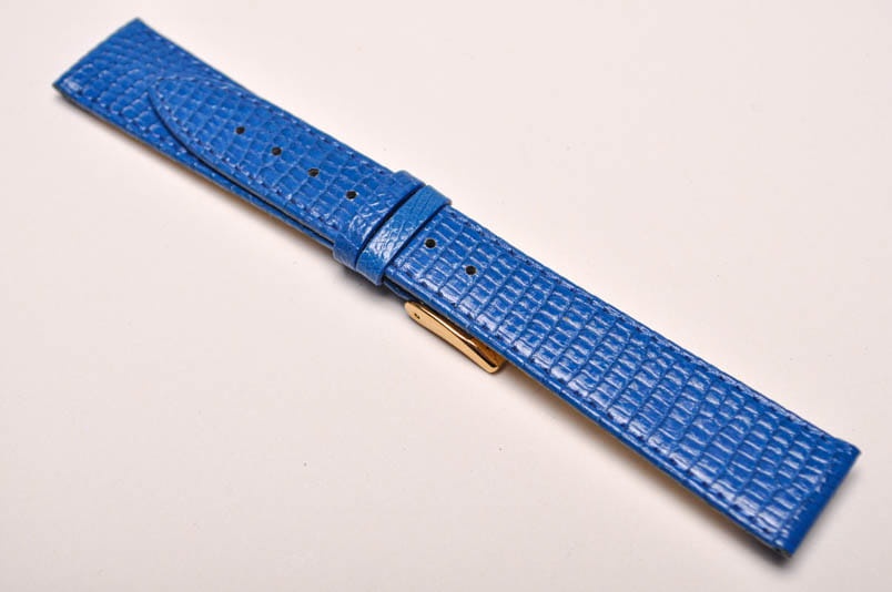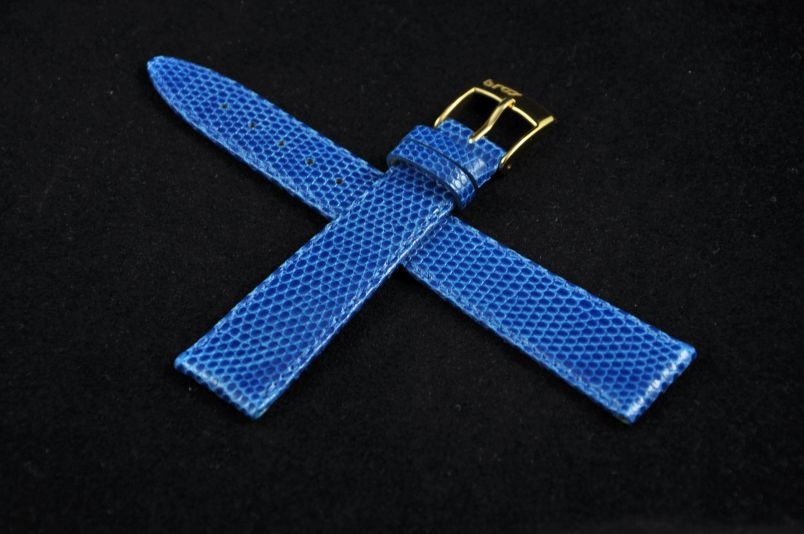 Wykonany z naturalnej skóry jaszczurki. Błyszczący, lakierowany w kolorze niebieskim. Obszyty nicią w kolorze paska. Podwójna szlufka. Stalowa klamerka. Grubość paska 2,2 mm.Elegancki, miękki pasek do klasycznych zegarków.