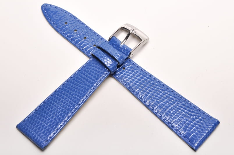 Wykonany z naturalnej skóry jaszczurki. Błyszczący, lakierowany w kolorze niebieskim. Obszyty nicią w kolorze paska. Podwójna szlufka. Stalowa klamerka. Grubość paska 2,2 mm.Elegancki, miękki pasek do klasycznych zegarków.