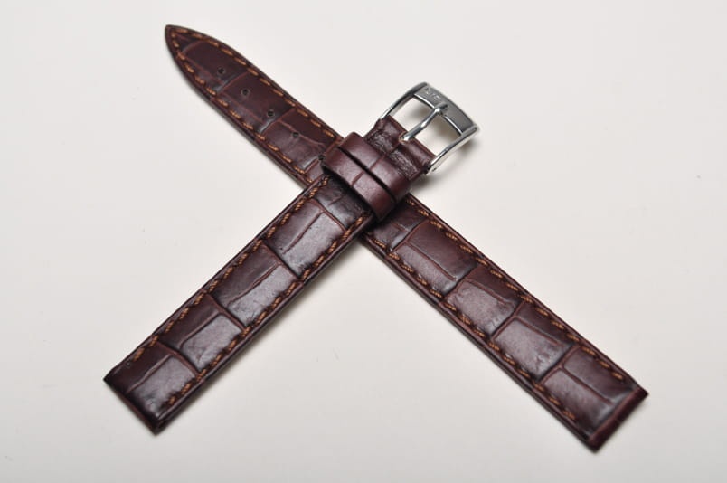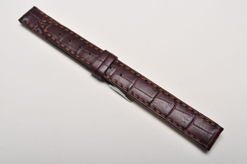 Uszyty z naturalnej skóry, imitacja skóry aligatora. W kolorze brązowym, półpołysk. Przeszyty brązową nicią. Podwójna szlufka, stalowa klamerka.