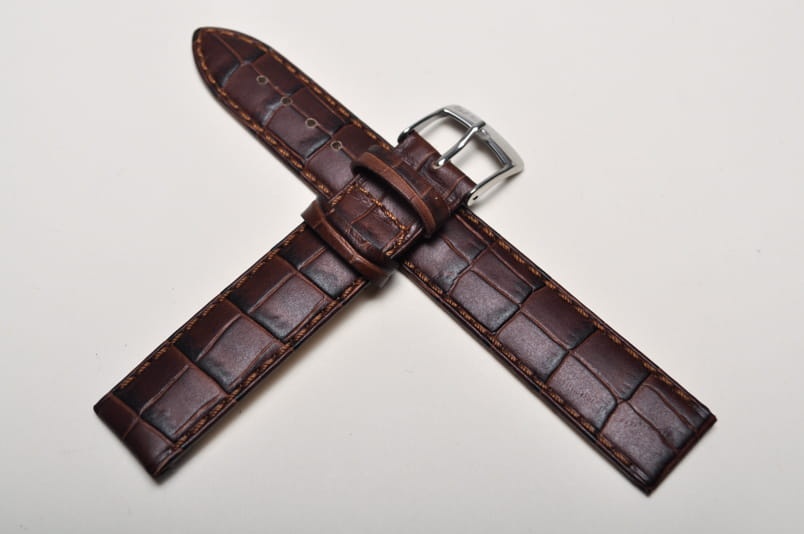 Uszyty z naturalnej skóry, imitacja skóry aligatora. W kolorze brązowym, półpołysk. Przeszyty brązową nicią. Podwójna szlufka, stalowa klamerka.