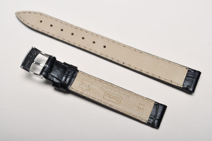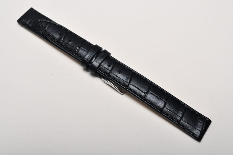 Uszyty z naturalnej skóry, imitacja skóry aligatora. W kolorze czarnym, matowy. Przeszyty zieloną nicią. Podwójna szlufka, stalowa klamerka.